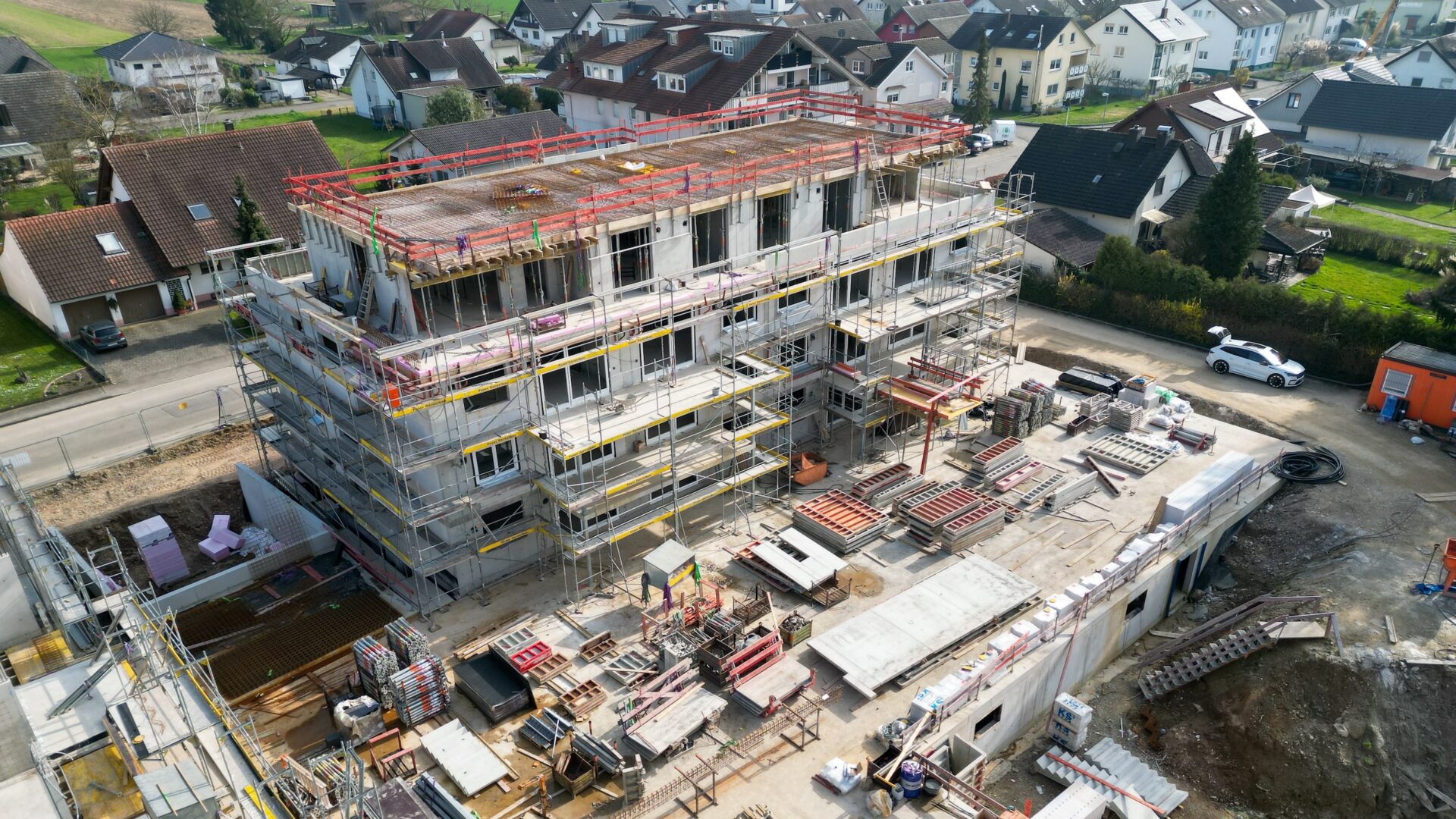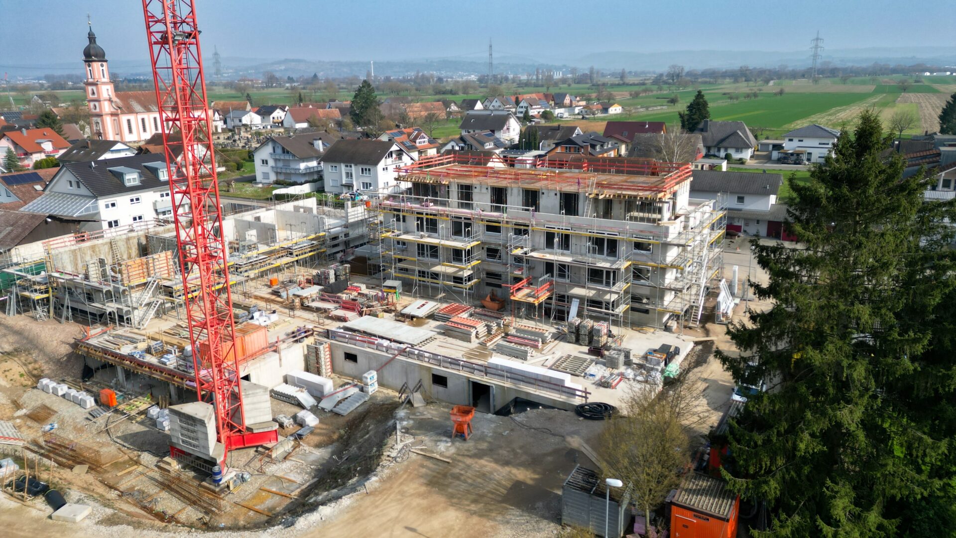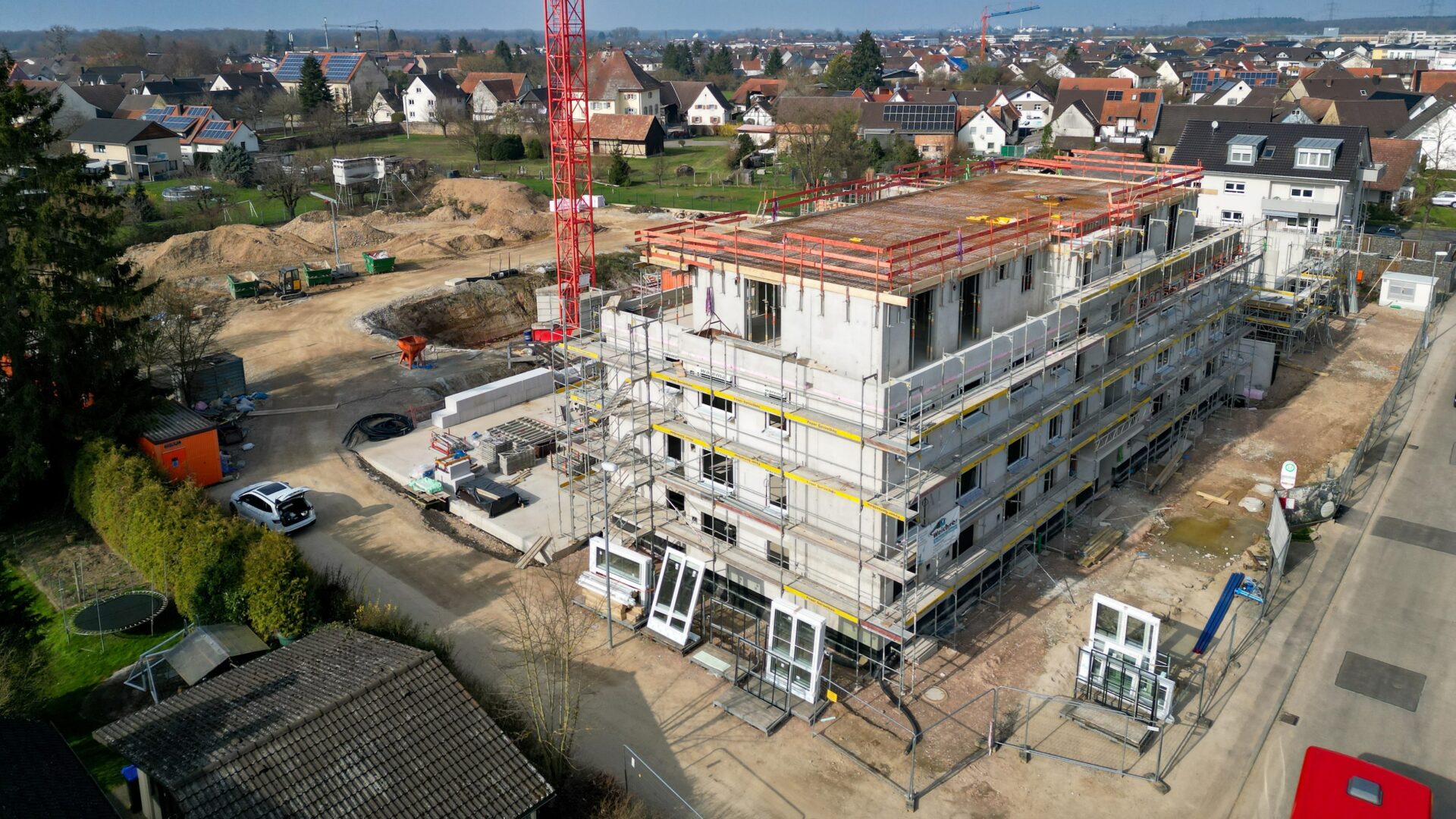 Insgesamt erstellen wir fünf repräsentative Gebäude um einen zentralen Spiel-Treff-Platz mit insgesamt 77 Wohnungen und einer gemeinschaftlichen Tiefgarage. Die dreigeschossigen Gebäude mit zusätzlichem Attikageschoss sind optimal in das Ortsbild eingebunden und geben ausreichend Freiraum. Insbesondere die modernen Penthouse Wohnungen geben einen freien Blick Richtung Schwarzwald im Osten und Vogesen im Westen. Die Grundschule, der Kindergarten, der REWE Supermarkt oder das Gesundheitszentrum sind fußläufig erreichbar.