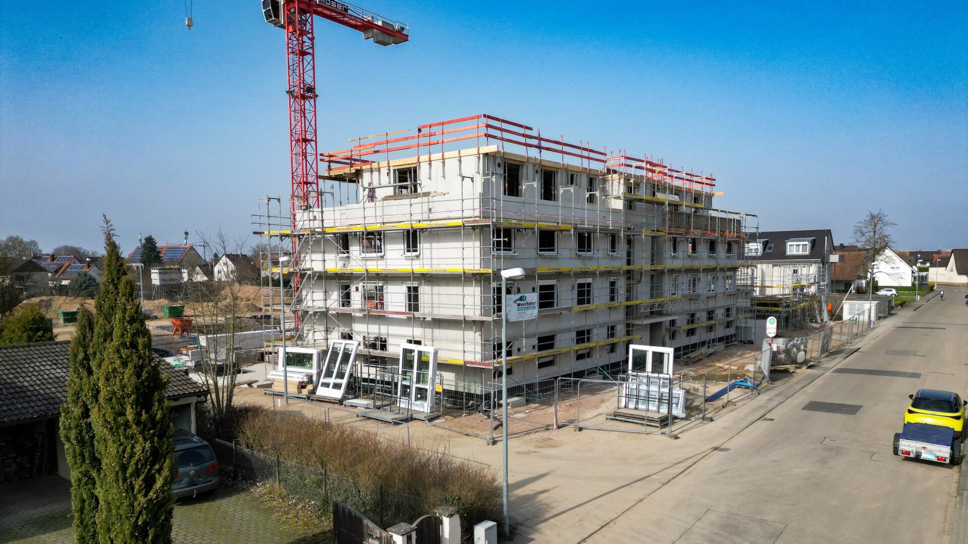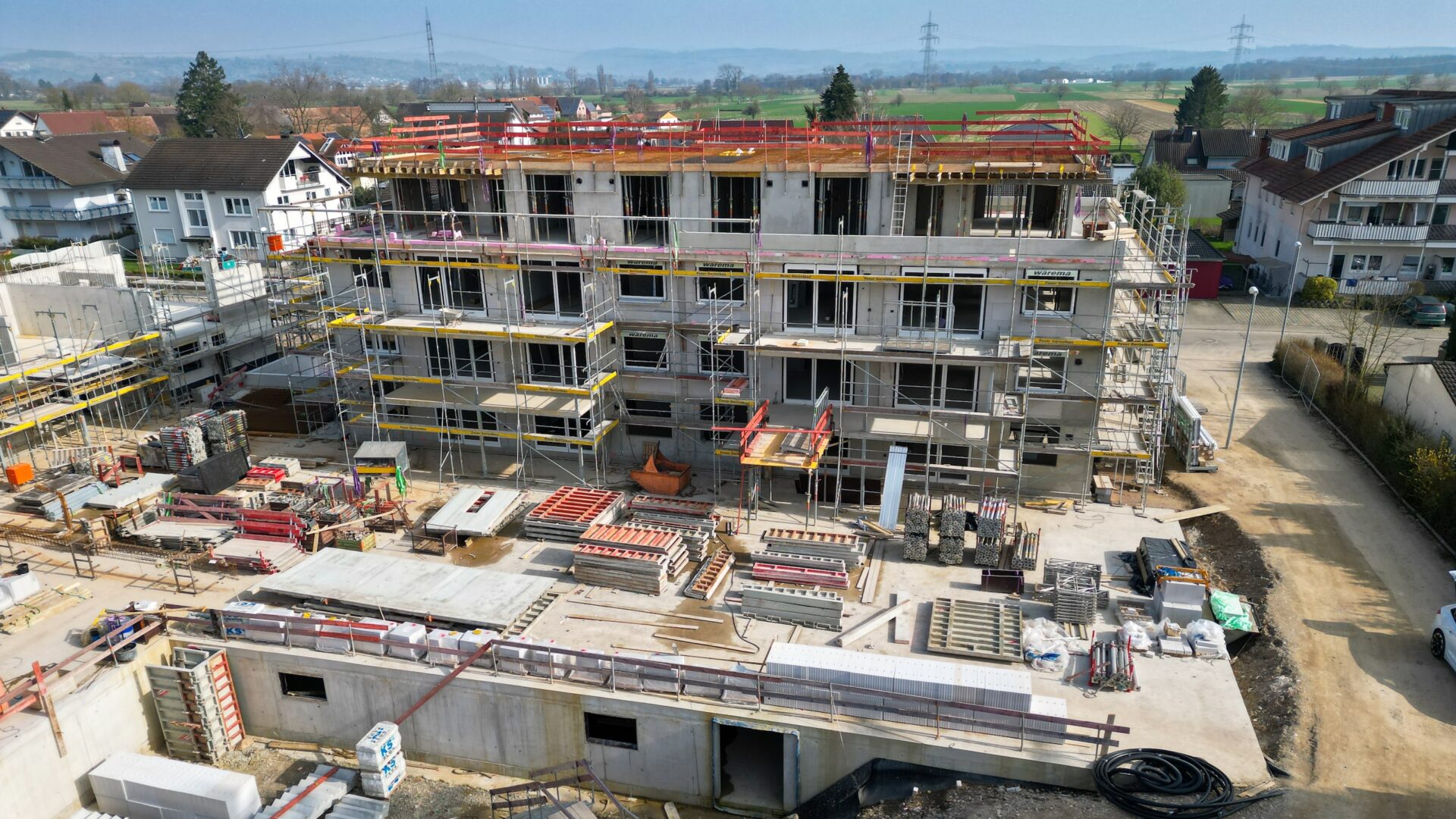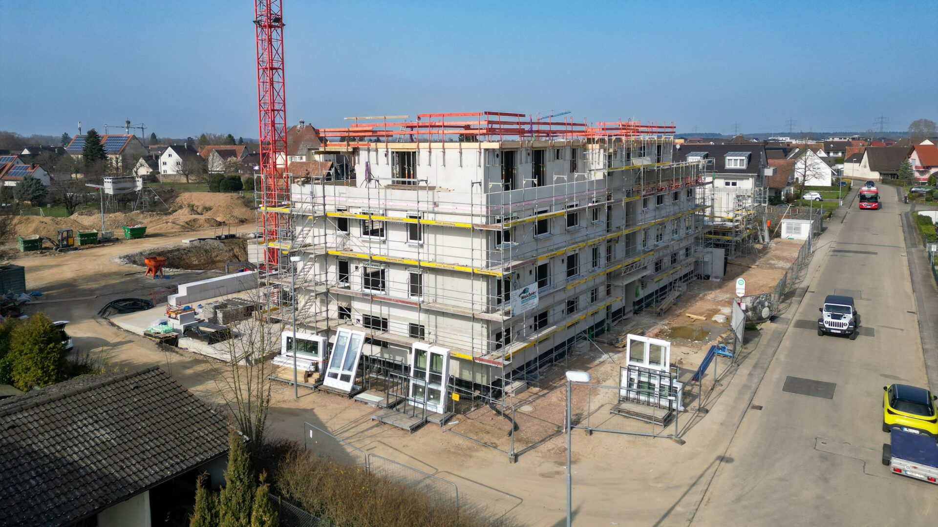 Insgesamt erstellen wir fünf repräsentative Gebäude um einen zentralen Spiel-Treff-Platz mit insgesamt 77 Wohnungen und einer gemeinschaftlichen Tiefgarage. Die dreigeschossigen Gebäude mit zusätzlichem Attikageschoss sind optimal in das Ortsbild eingebunden und geben ausreichend Freiraum. Insbesondere die modernen Penthouse Wohnungen geben einen freien Blick Richtung Schwarzwald im Osten und Vogesen im Westen. Die Grundschule, der Kindergarten, der REWE Supermarkt oder das Gesundheitszentrum sind fußläufig erreichbar.